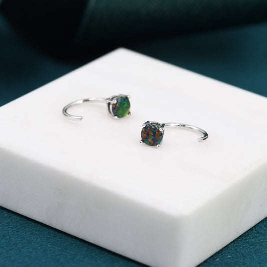 Black Opal Huggie Hoop Earrings in Sterling Silver, Tiny Opal Open Hoops, Opal Pull Through Threaders, Half Hoops, C Shape Opal Hoops