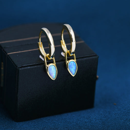 Blue Opal Dagger Huggie Hoop Earrings in Sterling Silver, Tiny Opal Bullet Hoops, Opal Hoops, Opal Droplet Hoops, Pear Shape Opal Hoops