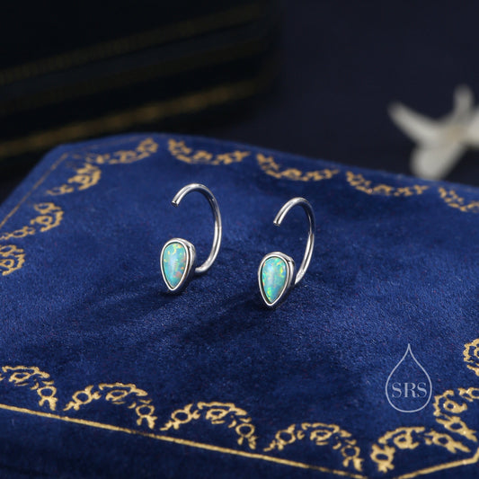 Aqua Green Droplet Opal Huggie Hoop Earrings in Sterling Silver, Opal Open Hoops, Opal Pull Through Threaders, Half Hoops, C Shape Hoops