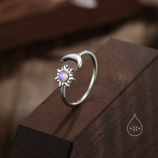 Sterling Silver Opal Moon Ring, Full Moon and Cresent Moon, Adjustable Sized Ring, Open Ring, Stacking Rings