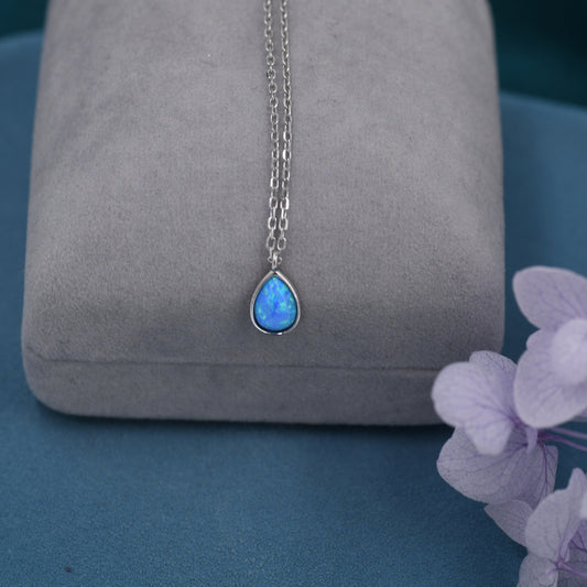 Blue Opal Droplet Pendant Necklace in Sterling Silver, Lab Opal Necklace, Pear Shape Opal Necklace, Fire Opal Necklace