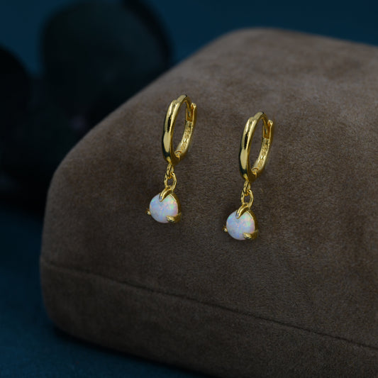 White Opal Dot Dangle Huggie Hoop Earrings in Sterling Silver, 4mm Tiny Opal Hoops, Opal Hoops, Fire Opal Hoops