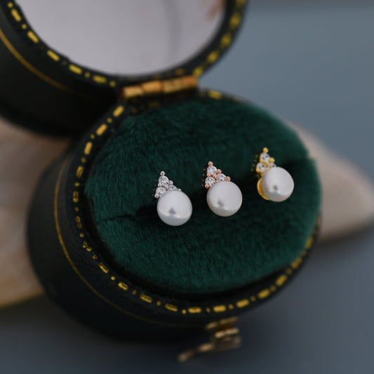 Genuine Freshwater Pearl CZ Trio Stud Earrings in Sterling Silver, Delicate Tiny Pearl and CZ Earrings, Trinity Pearl, Genuine Pearls.