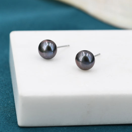 Natural Black Pearl Stud Earrings in Sterling Silver, Various Sizes, Button Shape Black Freshwater Pearl Earrings, Natural Pearl Earrings
