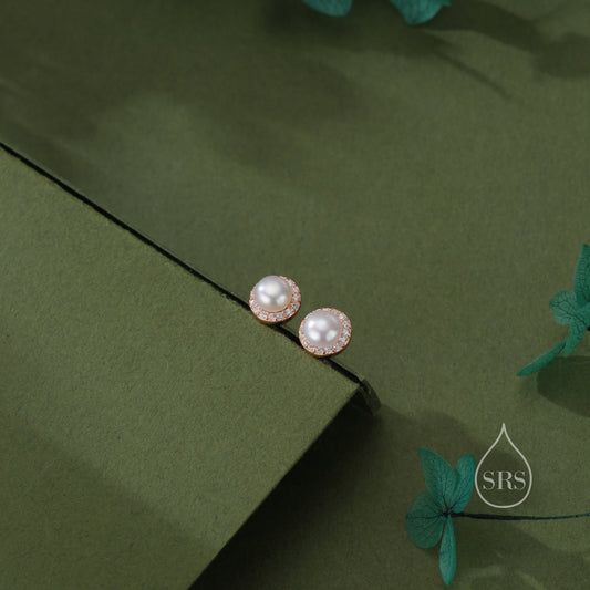 Genuine Freshwater Pearl CZ Stud Earrings in Sterling Silver, Delicate Keshi Pearl Halo CZ Earrings, Genuine Freshwater Pearls.