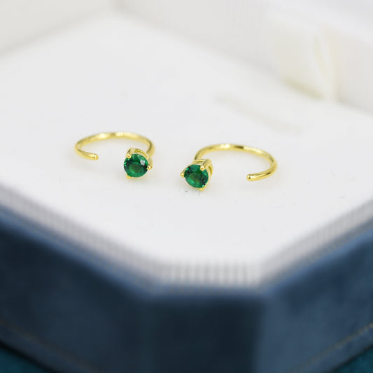Emerald Green CZ Crystal Huggie Hoop Threader Earrings in Sterling Silver, 3mm Three Prong, Gold or Silver, Pull Through Open Hoops