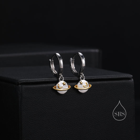 Planet and Gold Star Huggie Hoop Earrings in Sterling Silver, Saturn Dangle Hoop Earrings