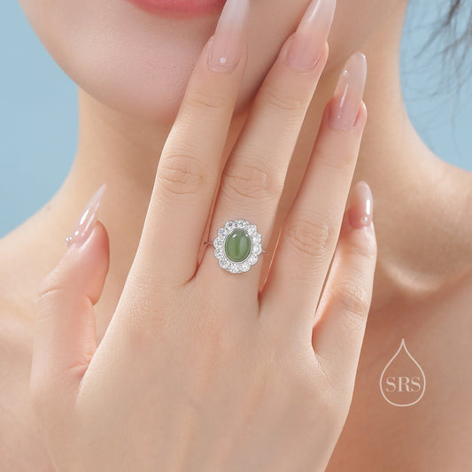 Sterling Silver Vintage Inspired Green Jade CZ Ring, Adjustable Size, Natural Green Jasper Jade Ring, Vintage Style Jade Ring