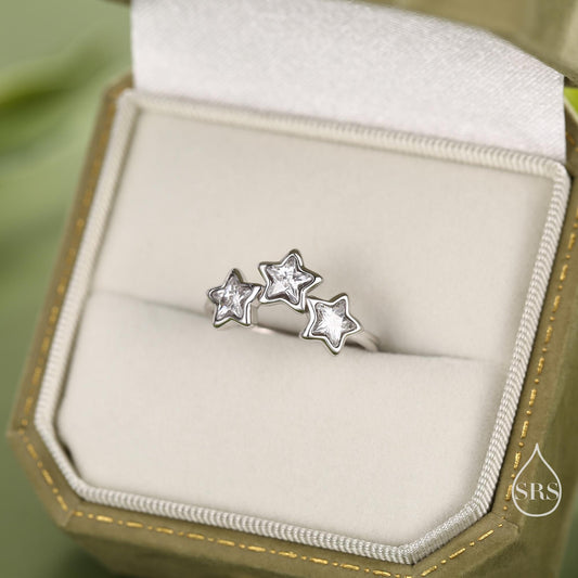 Sterling Silver Triple Star CZ Ring, Blue or Clear CZ Crystal Star Ring, Adjustable Size, Celestial Jewellery, CZ Star Ring