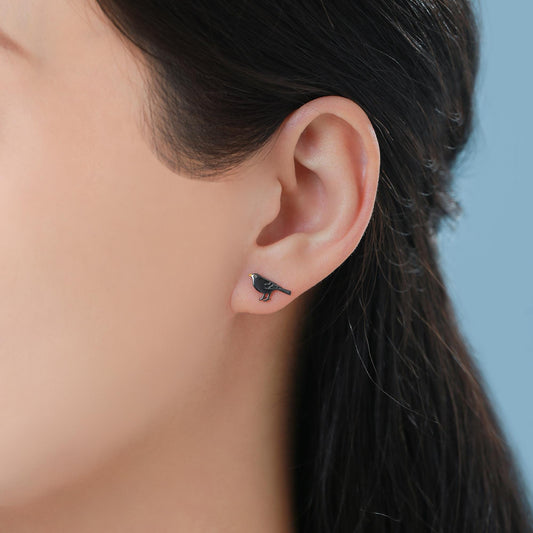 British Black Bird Stud Earrings in Sterling Silver with Yellow Beak - Black Rhodium Coated Sterling Silver, Animal Stud Earrings