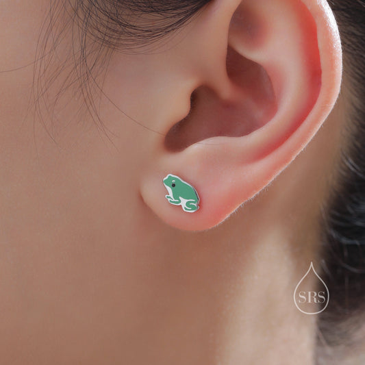 Tiny Enamel Frog Stud Earrings in Sterling Silver, Kawaii Frog Earrings, Green Frog Earrings, Nature Inspired