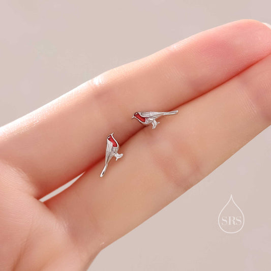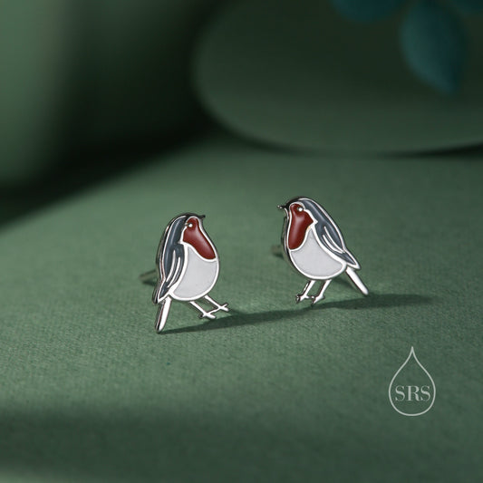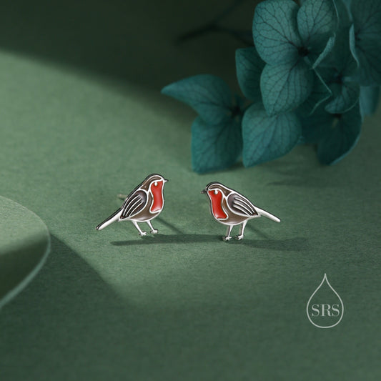 Tiny Robin Bird Stud Earrings in Sterling Silver with Hand Painted Enamel, Sterling Silver Robin Earrings, Nature Inspired