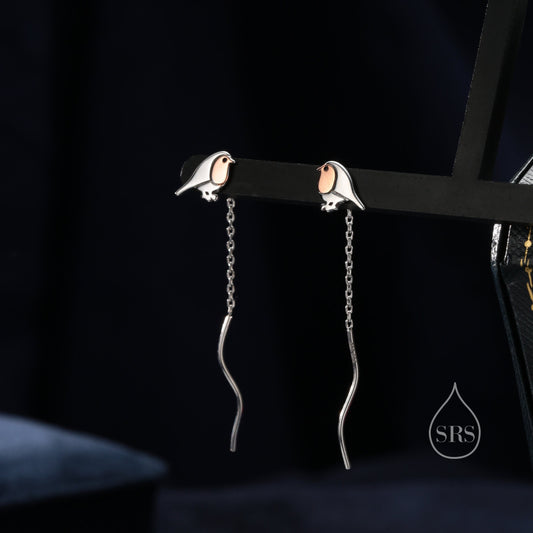 Robin Bird Threader Earrings in Sterling Silver, Robin Ear Threaders, Silver Animal Earrings, Nature Inspired Jewellery