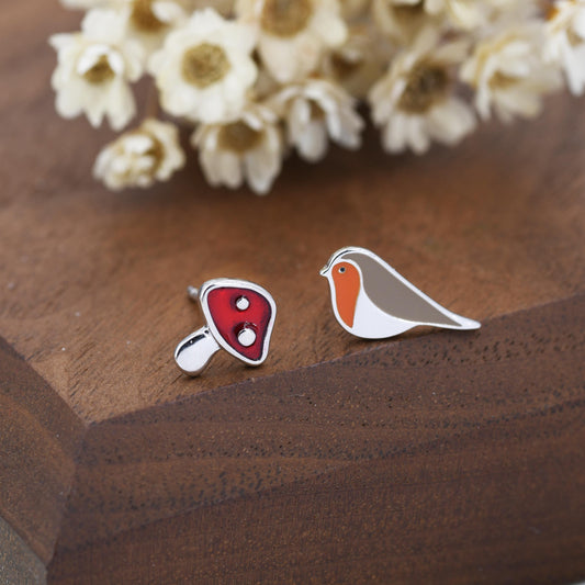 Mismatched Robin Bird and Mushroom Stud Earrings in Sterling Silver, Asymmetric Red Mushroom and Robin Earrings, Hand Painted Enamel