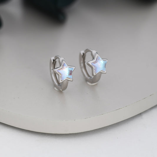 Moonstone Star Huggie Hoop Earrings in Sterling Silver, Silver or Gold, Simulated Moonstone Star Hoops, Celestial Earrings, Star Earrings