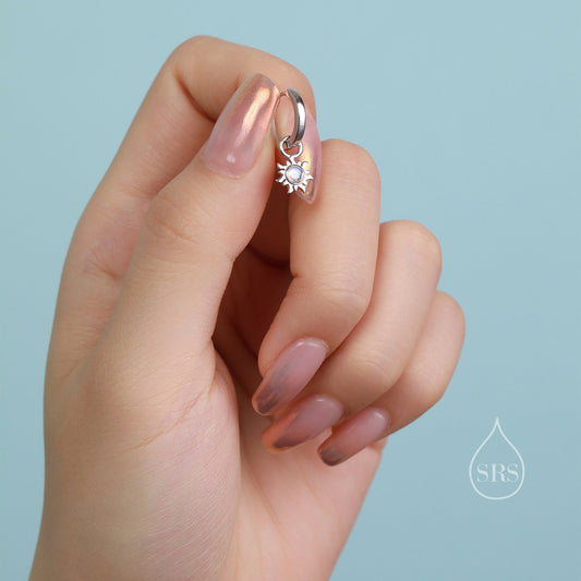 White Opal Sun Dangle Huggie Hoop Earrings in Sterling Silver, Silver or Gold, Sun Earrings, Celestial Earrings, Detachable Fire Opal Sun