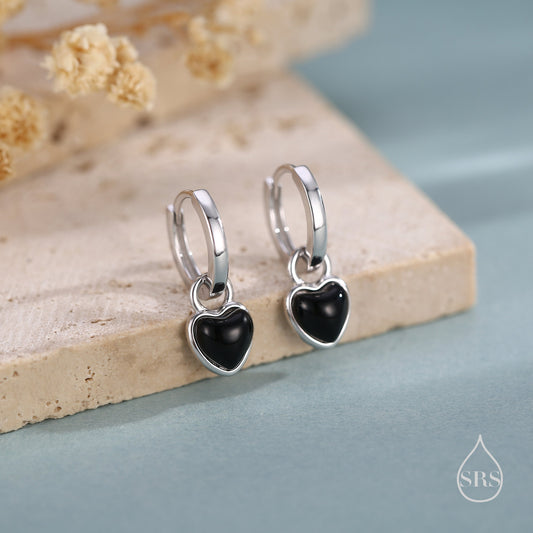 Natural Black Onyx Heart Dangle Huggie Hoop Earrings in Sterling Silver, Silver or Gold, Detachable Genuine Black Onyx Heart Charm Hoops