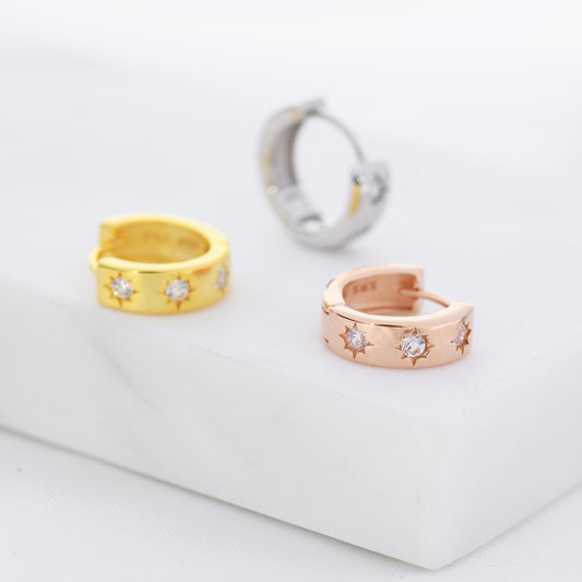 Sterling Silver Starburst CZ Hoop Earrings, Silver, Gold, Rose Gold, 4mm Thick Hoops, Star CZ Hoops