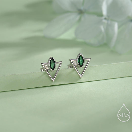 Sterling Silver Triangle and Emerald Green Marquise CZ Arrow Arrowhead Stud Earrings, Silver, Gold, Open Triangle Earrings