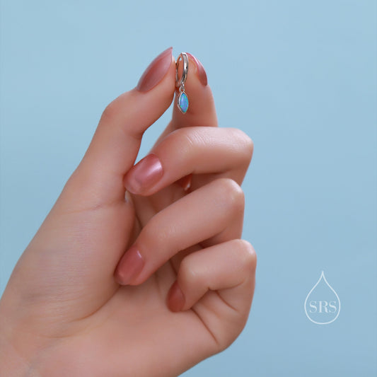 Marquise Opal Huggie Hoops in Sterling Silver, 8mm Opal Hoops, Blue Opal or White Opal, Silver or Gold, Fire Opal Earring