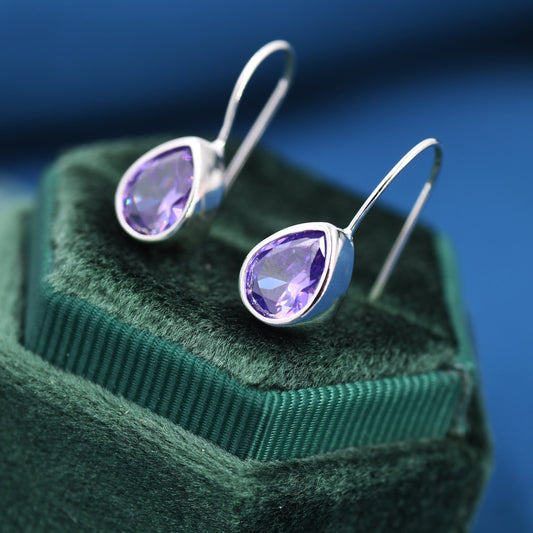 Sterling Silver Amethyst Purple CZ Droplet Drop Earrings in Sterling Silver, Silver or Gold, Chunky Pear Shape Hook Earrings