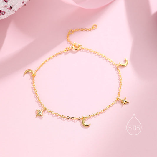 Sterling Silver Moon and CZ Star Bracelet, Silver or Gold or Rose gold, Moon and Star Charm Bracelet, Celestial Jewellery