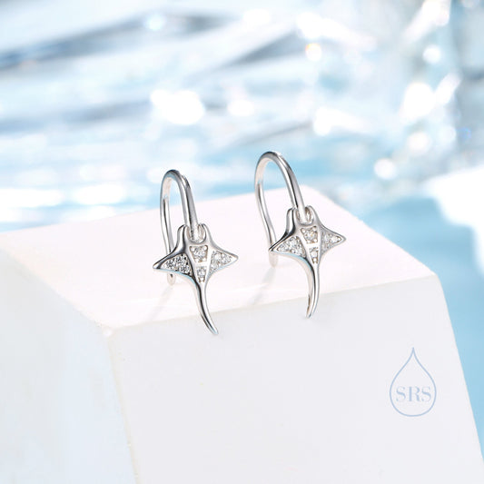 Sterling Silver Manta Ray Fish Drop Hook Earrings with CZ, Stingray Dangle Hoop Earrings, Dainty Zircon Fish Dangle Earrings