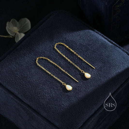 Sterling Silver White Opal Droplet Ear Threader Earrings, Silver or Gold, Lab Opal Drop Earrings, Geometric Minimalist Threader Earring
