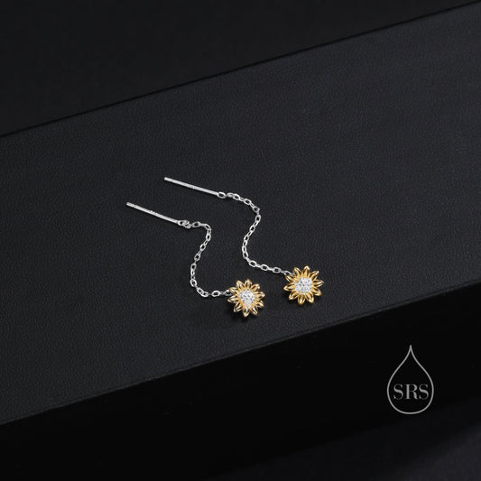Sunflower Threader Earrings in Sterling Silver, Sunflower with Dangle Chain Earrings, SunFlower Pull Through Chain Earrings