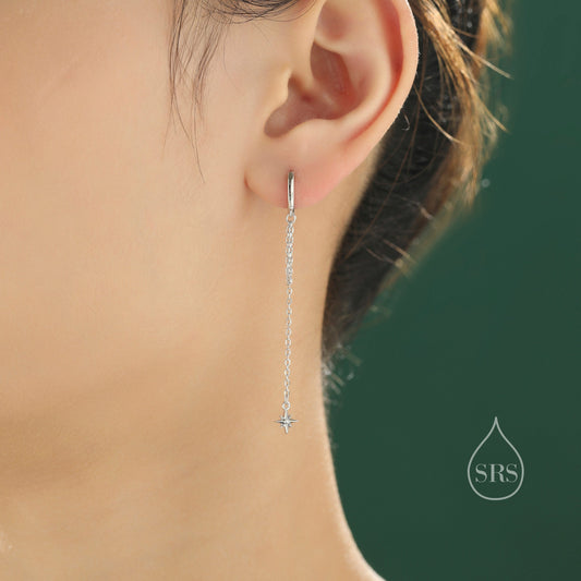 Tiny CZ Starburst Dangle Chain Huggie Hoop Earrings in Sterling Silver, Silver, Gold or Rose Gold, North Star Earrings, Sunburst Earrings