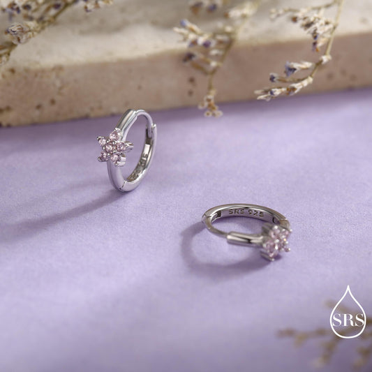 Pale Pink CZ Flower Huggie Hoops, CZ Hoop Earrings, Crystal Flower Huggie Earrings, Pink Hoop Earrings
