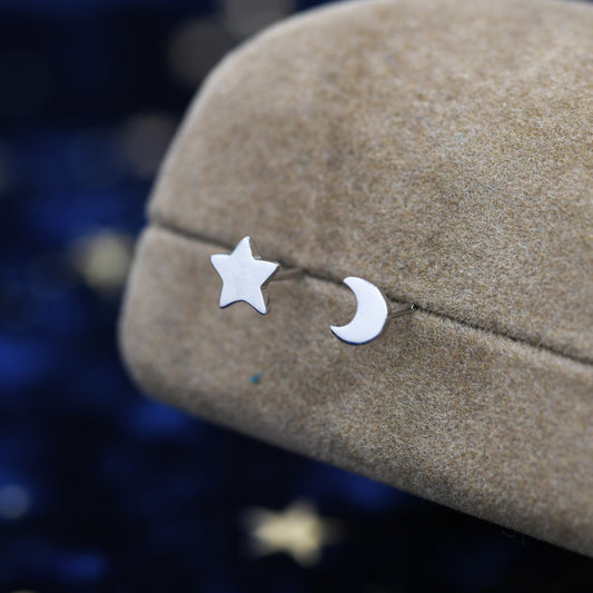 Tiny Chubby Star and Moon Stud Earrings in Sterling Silver, Mismatched Star and Crescent Moon Celestial Stud, Polished or Textured