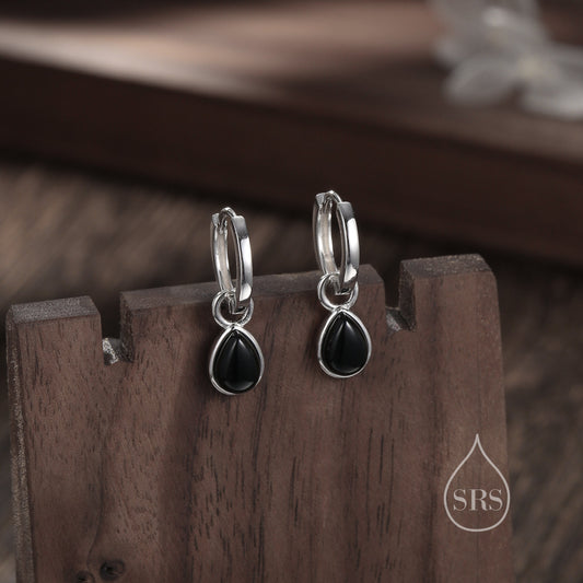 Sterling Silver Genuine Black Onyx Droplet Hoop Earrings, Detachable Pear Shape Black Onyx Dangle Hoop Earrings, Interchangeable