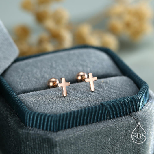 Tiny Cross Screw Back / Flat Back/ Stud Earrings in Sterling Silver, Silver or Gold or Rose Gold, Small Cross Barbell Earrings