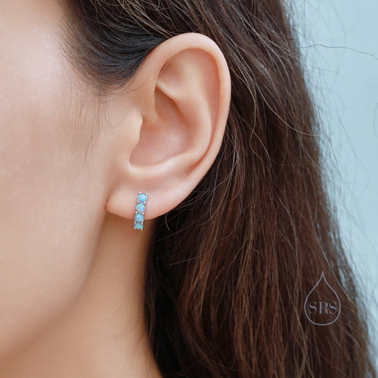 Sterling Silver Opal Huggie Hoop Earrings, Gold Hoop, Blue and White Opal, Minimalist Geometric Hoop Earrings