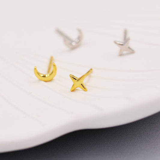 Mismatched Four Point Star and Moon Stud Earrings in Sterling Silver, Crescent Moon Celestial Stud, Polished or Textured, Gold or Silver