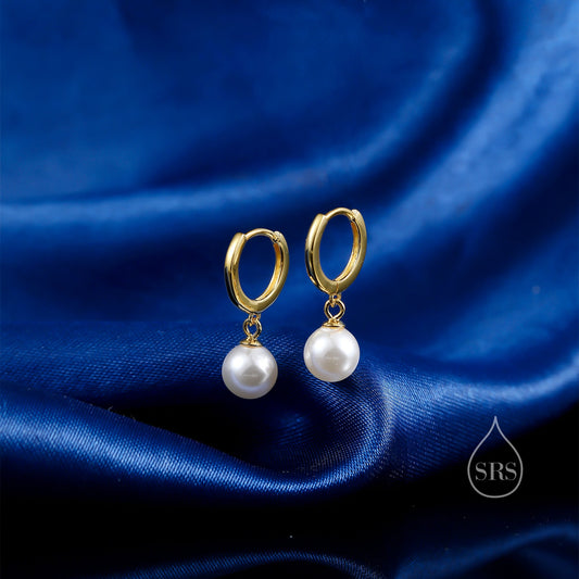 Mother of Pearl Huggie Hoop Earrings in Sterling Silver, Simple Pearl Dangle Earrings, Gold and Silver