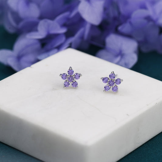 Pair Amethyst Purple CZ Flower Stud Earrings in Sterling Silver, Silver or Gold, Crystal Flower Earrings, Stacking Earrings