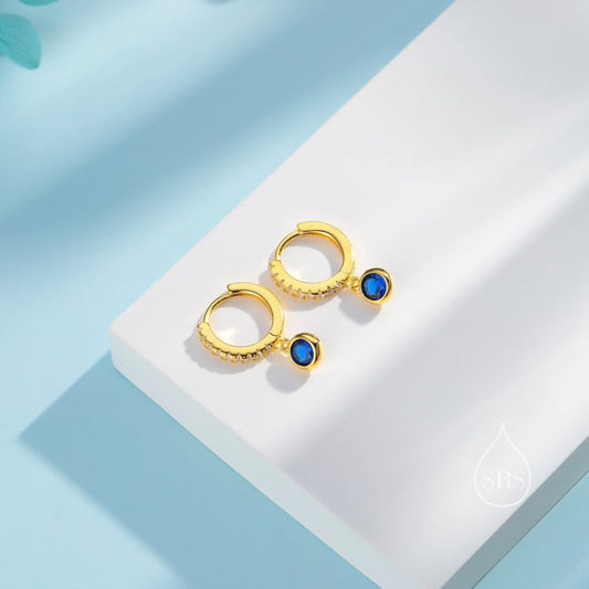 Sapphire Blue CZ Dangle Huggie Hoop in Sterling Silver, Silver or Gold, Skinny CZ Dangle Earrings, CZ Hoops