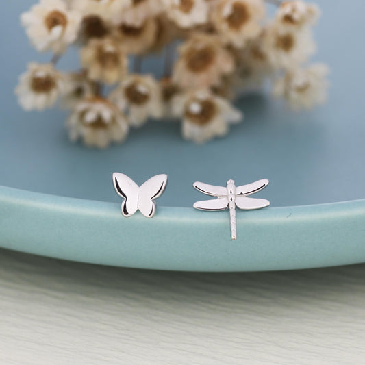 Mismatched Butterfly and Dragonfly Stud Earrings in Sterling Silver, Silver, Gold or Rose Gold, Asymmetric Dragonfly and Butterfly Earrings