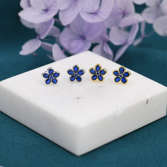 Sapphire Blue Flower CZ Stud Earrings in Sterling Silver, Forget Me Not Floral CZ Earrings, Silver or Gold, Flower CZ Earrings