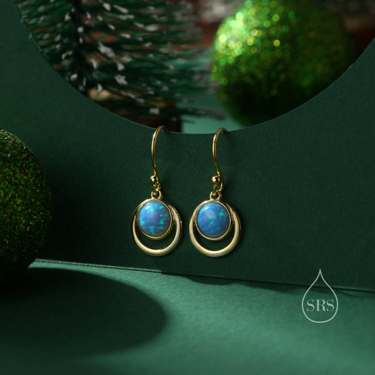 Blue Opal and Circle Drop Hook Earrings in Sterling Silver, Delicate Blue Opal Geometric Earrings, Opal Coin Earrings