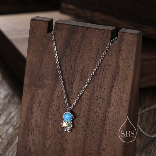 Astronaut Pendant Necklace in Sterling Silver with Lab Opal, Spaceman Holding Star Necklace, Space Planet Celestial Jewellery