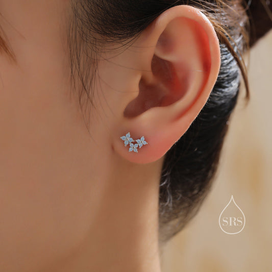 Asymmetric Hydrangea Flower Bouquet CZ Stud Earrings in Sterling Silver, Silver, Gold or Rose Gold, Mismatched Opal Blue Flower Earrings