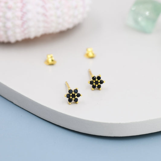 Pair of Very Tiny Black CZ Flower Stud Earrings in Sterling Silver, Silver or Gold, Crystal Flower Earrings, Stacking Earrings