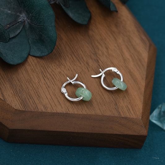 Sterling Silver Aventurine Jade Donut Huggie Hoop Earrings, Detachable Green Jade Coin Charm Dangle Hoop Earrings, Silver or Gold