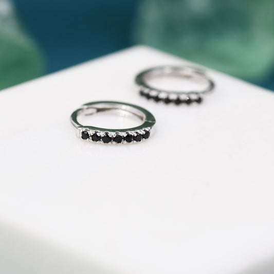 Skinny Huggie Hoop Earrings in Sterling Silver with Black CZ Crystals, Tiny Snug Hoop Earrings, Black Diamond, Simple Hoop Earrings