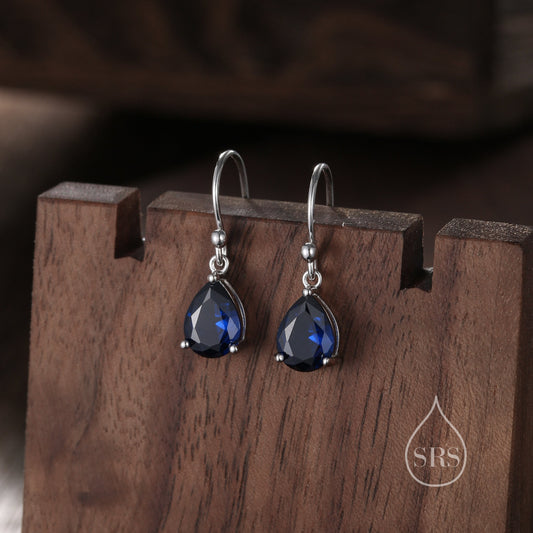 Sapphire Blue Pear Cut CZ Drop Earrings in Sterling Silver, Silver or Gold, Blue Droplet Dangle Earrings