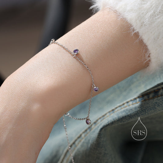 Purple CZ Charm Bracelet in Sterling Silver, Silver or Gold, Amethyst Purple CZ Bracelet, Satellite Bracelet