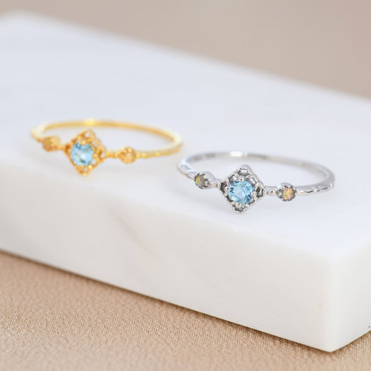 Natural Swiss Blue Topaz Stone and Opal Ring in Sterling Silver, Silver or Gold, Natural Topaz Ring, Vintage Inspired Design, US 5-8